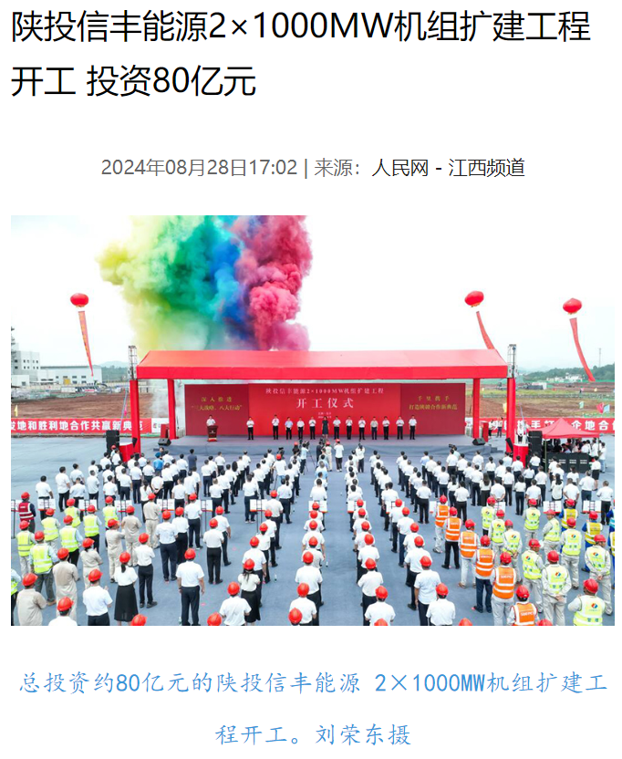 8月28日,陕投信丰能源 2×1000MW机组扩建工程(信丰电厂二期项目)在信丰县开工。人民网、江西日报、赣州新闻联播等多家主流媒体进行报道。