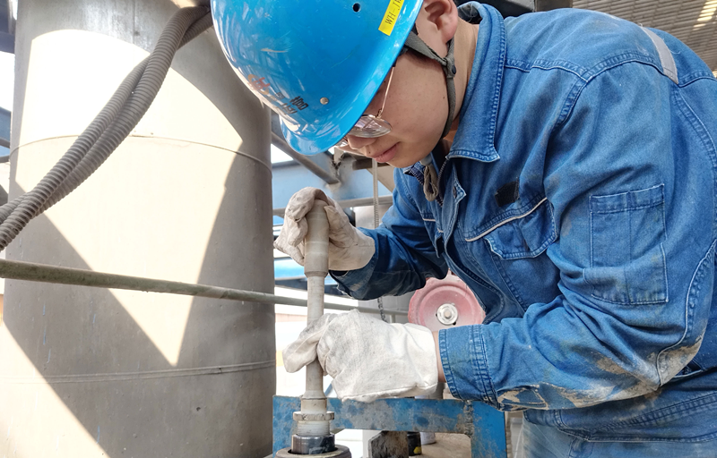 做好风险辨识、隐患排查、“两交底”等准备工作,陈涛拿起扳手,开始拆卸滤网端盖。由于管道系统密集,他只能蜷身在管道的空隙间,一手握扳手,一手固定端盖,小心松动螺丝。室内空间狭小闷热,不一会儿,他的脸上便浸满细密的汗珠。紧完最后一根螺栓,滤网更换完成,陈涛才拖着僵硬的身子,从管道的间隙钻出来,边活动麻木的双腿,边擦拭着脸上的汗水。“这点活,也就是一碟小菜,只要机组运行平稳,大家安心过节,这点辛苦,值了!”陈涛憨笑着说。